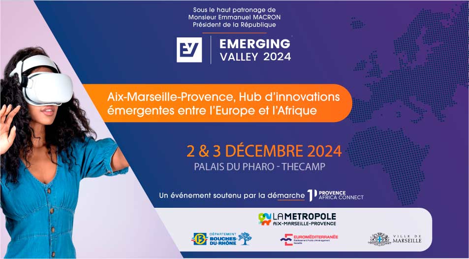 Créé en 2017, à Aix-Marseille-Provence, le nouveau hub des innovations émergentes entre l’Europe et l’Afrique, EMERGING Valley est le sommet international qui attire, en Provence, les investisseurs, les start-up et les écosystèmes numériques africains et émergents, qui veulent renforcer leur attractivité à l’internationale, développer leurs relations business et accélérer leur impact à l’échelle globale. Véritable passerelle entre la tech africaine et européenne, EMERGING Valley est un rendez-vous unique pour :