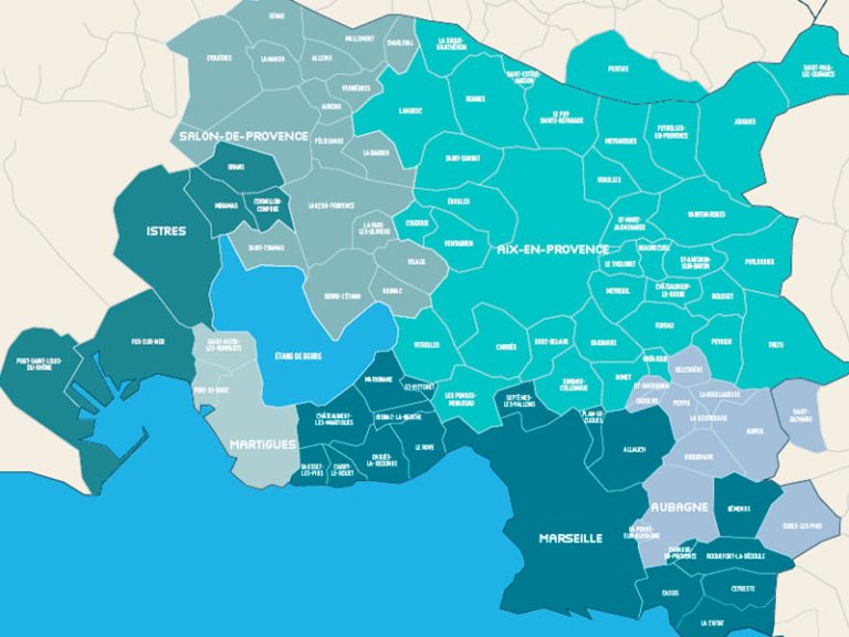 La Métropole Aix-Marseille-Provence regroupe 92 communes, dont une du Vaucluse (Pertuis), une du Var (Saint-Zacharie) et 90 des Bouches-du-Rhône sur un territoire de 3 148 km2. Elle est ainsi la plus vaste de France : quatre fois le Grand Paris et six fois le Grand Lyon.