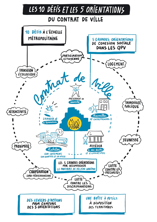 - un socle métropolitain qui présente une vision collective et partagée. Il identifie les grandes priorités qui font sens pour l’ensemble des quartiers prioritaires de la politique de la ville (QPV) du territoire métropolitain ;