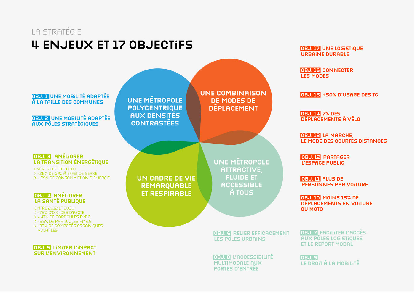 Il présente un plan d’actions qui s’articule avec les différentes démarches stratégiques régionales et métropolitaines. Le Plan de Mobilité s’inscrit dans le cadre du Schéma Régional d’Aménagement et de Développement Durable et d’Egalité des Territoires (SRADDET). Il est en cohérence avec les orientations stratégiques des documents cadres de la Métropole telles que le Schéma de Cohérence territorial (SCOT), le Projet métropolitain, le Plan Climat Air Energie, l’Agenda économique.