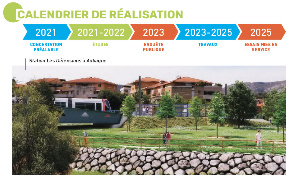 Le projet Val’Tram consiste à prolonger la ligne de tramway en exploitation sur Aubagne, dans la vallée de l’Huveaune, jusqu’à La Bouilladisse. La mise en service est prévue fin 2025. Le projet empruntera la plateforme de l’ancienne voie ferrée, dite de Valdonne, sur 13,2 km. Les travaux de déviation des réseaux dans Aubagne, nécessaires à cette opération, ont été engagés en juillet 2023. Pour rappel, il desservira cinq communes (La Bouilladisse, La Destrousse, Auriol, Roquevaire et Aubagne). 60 000 voyageurs seront ainsi directement desservis.