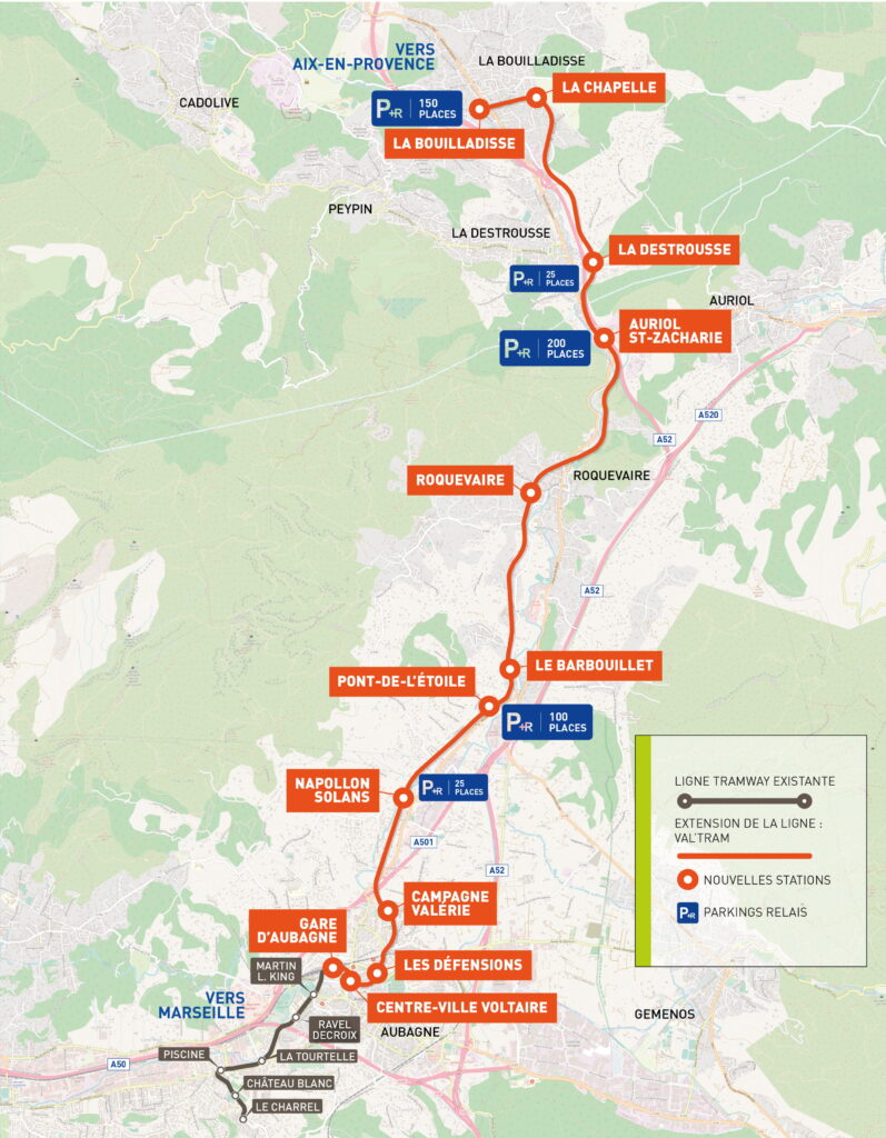 Le projet Val’Tram consiste à prolonger la ligne de tramway en exploitation sur Aubagne, dans la vallée de l’Huveaune, jusqu’à La Bouilladisse. La mise en service est prévue fin 2025. Le projet empruntera la plateforme de l’ancienne voie ferrée, dite de Valdonne, sur 13,2 km. Les travaux de déviation des réseaux dans Aubagne, nécessaires à cette opération, ont été engagés en juillet 2023. Pour rappel, il desservira cinq communes (La Bouilladisse, La Destrousse, Auriol, Roquevaire et Aubagne). 60 000 voyageurs seront ainsi directement desservis.
