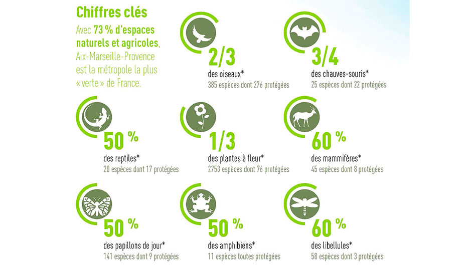 - 1 parc national des Calanques, seul parc à la fois terrestre, marin et périurbain d’Europe ;